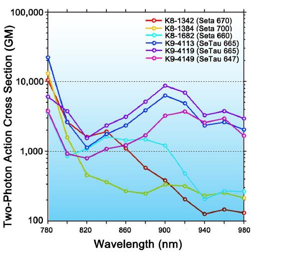 The relevant 2PA wavelengths for several Seta and SeTau dyes are provided in the table below.