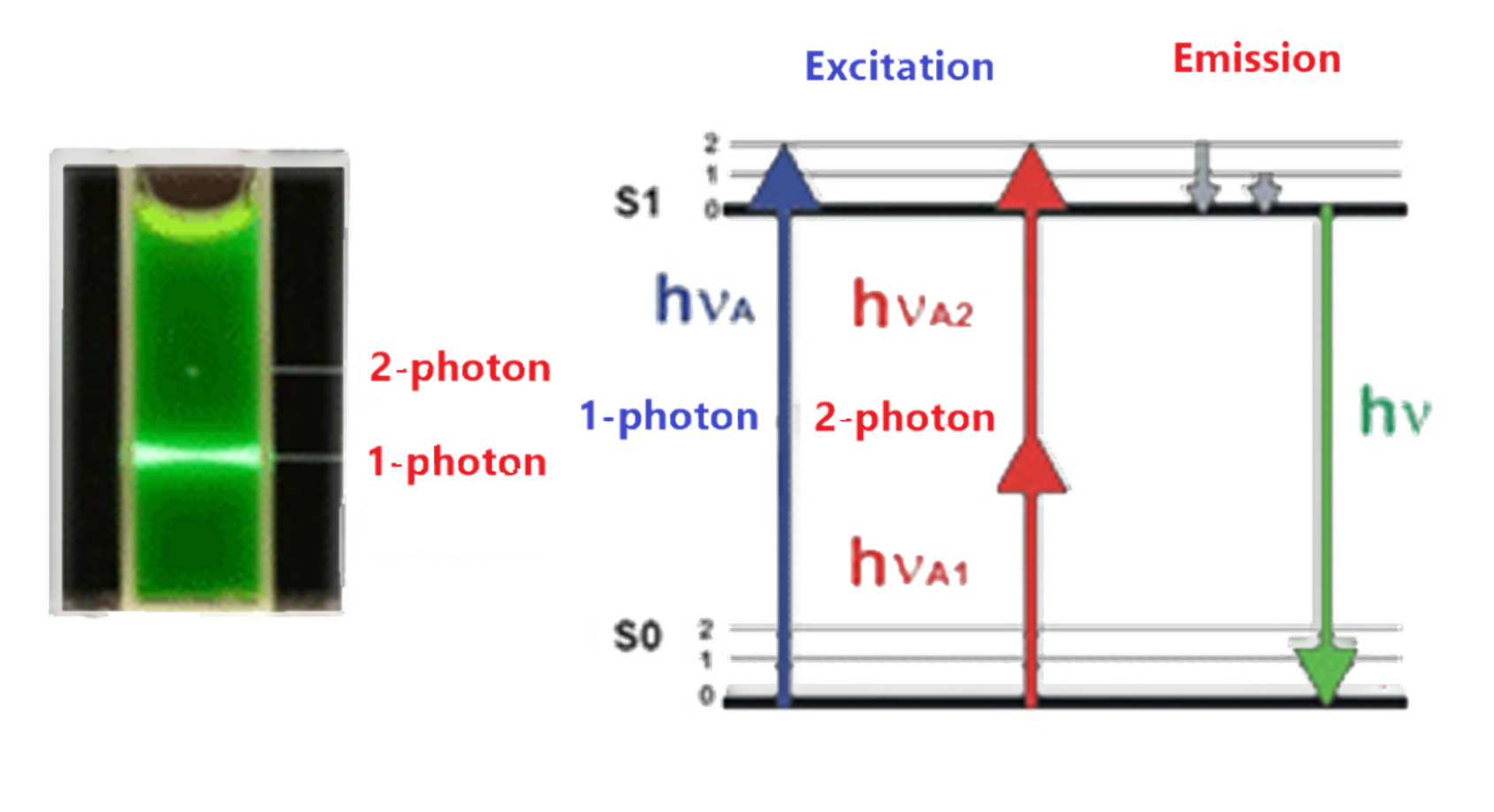 Nonlinear 2-photon excitation is based on the simultaneous absorption of two photons. Since the energy of a photon is inversely proportional to its wavelength, the two absorbed photons must have a wavelength about twice that of one-photon excitation. In 2-photon microscopy, two excitation photons from a pulsed laser (e.g., Ti:Sapphire or Nd:YLF laser) are combined to excite a fluorescent molecule. The molecule then emits a photon in the visible wavelength. 2-photon microscopy allows for out-of-focus background rejection similar to confocal microscopy.