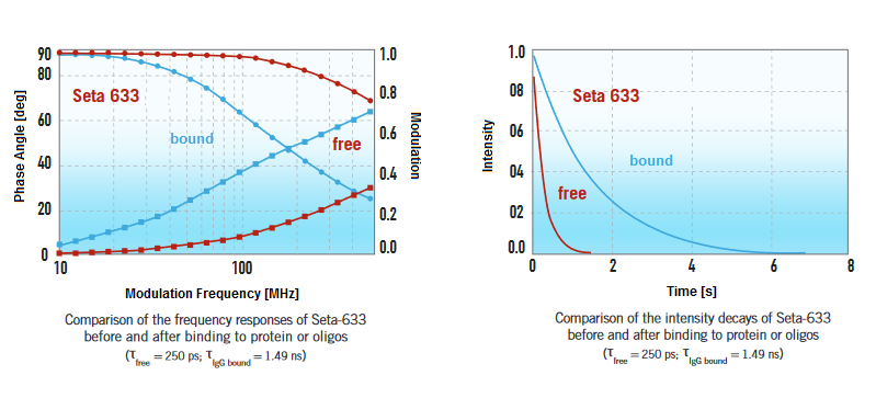 The lifetime-sensitive Seta labels Seta-633-azide or Seta-670-azide exhibit shorter fluorescence lifetimes (FLTs) in aqueous media or when labeled to low molecular weight analytes (drugs or small ligands), but increased brightness and up to ten-times longer FLTs when bound to proteins or oligonucleotides, and are unique tracers for FLT-based assays.