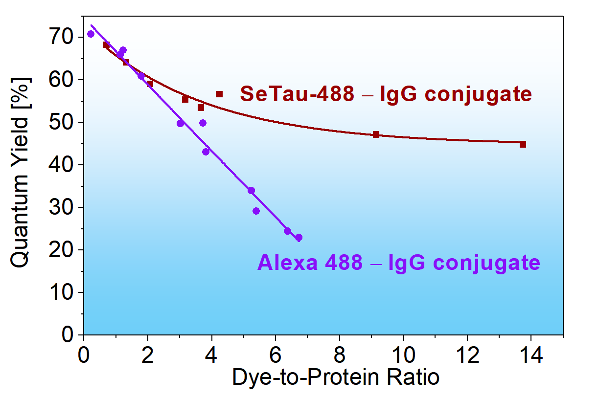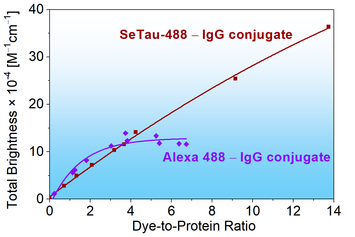 SeTau-488 with a similar absorption and emission as Alexa 488 (Φ = 0.92, ε = 73,000 M-1cm-1 and Φ∙ε = 67,160 M-1cm-1) exhibits a lower brightness as a free dye, but its brightness gets increased when it is attached to a biomolecule, and it becomes an almost unquenchable fluorophore when labeled to an antibody (see specs sheet). Exc./Em. max of IgG-conjugates: 486/532 nm.