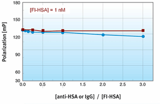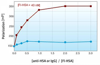 On one side, HSA (the antigen) is labeled with SeTau-425, a long-lifetime label with a lifetime of 26 ns (left), and on the other side (right) with fluorescein, a commonly used 4 ns label. In the case of SeTau-425, the labeled HSA has still a relatively low starting polarization of 165 mP and only upon binding to the specific antibody the rotational mobility changes and as a result the polarization increases. A different behavior is seen with the fluorescein-labeled antigen (right): the labeled antigen has a polarization of 130 mP. Typically one would expect a much higher value, but the lower polarization is due to the fact that several fluorescein molecules are labeled on one HSA molecule and undergo homo-FRET. Due to homo-FRET, the polarization value for the conjugate decreases. Nevertheless, the important observation here is, that there is no polarization increase observed upon titration with the specific (red) or non-specific (blue) antibody due to the fact that the lifetime of fluorescein (τ = 4 ns) is much shorter than the rotational correlation time (Θ = 40 ns) of the antigen.