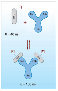 For a demonstration of the behavior of a short lifetime probe vs. a longer lifetime probe in a Fluorescence Polarization Immunoassay (FPIA) we use the example of an FPIA of HSA (MW ~ 66.5 KDa):