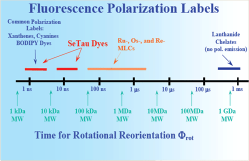 SeTau FP labels exhibit lifetimes from 9 to 32 ns and are suitable for measurement of antigens with molecular weights in the range between 10 and 80 kDa. This MW-range has not been addressed with common polarization labels or metal-ligand complexes (MLCs) based on Ru, Os or Re.