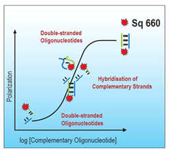 DNA hybridization reactions can be easily monitored by means of fluorescence polarization using the newly developed fluorescence labels from SETA BioMedicals. Square-660-NHS is a fluorescent label that is easily coupled to amino-modified oligonucleotides. It is a very sensitive fluorescent polarization label with absorption and emission maxima and the NIR range. Covalent attachment to an oligonucleotide results in an about 10-fold increase of its fluorescence lifetime (lifetime for labeled oligos are in the order of 3 ns) and a low initial polarization of the labeled oligonucleotide. Interaction of the dye-labeled oligonucleotide (see below) with the complementary oligonucleotide or DNA leads to a significant change in fluorescence polarization due to the increase in mass and reduction in lifetime of Square 660 (from 3 ns to 1.8 ns) upon binding of the complementary strand or DNA, which further helps to increase the dynamic range of the assay. Based on the increased lifetimes of Square-660 in presence of oligonucleotides this dye is perfectly suited as a label for in-situ hybridization assays using fluorescence polarization as the read out parameter.
