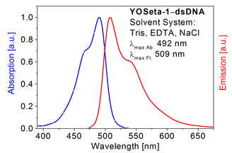 Absorption and emission spectrum of YOSeta-1 in presence of dsDNA