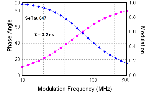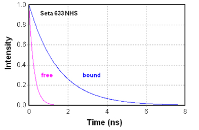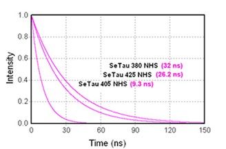 SeTau-647-NHS, SeTau-647-Maleimide, and SeTau-647-di-NHS are FLT labels with lifetimes that are insensitive to the environment. The average lifetime of these labels is in the order of 3 ns, which makes them superior lifetime or polarization probes over Cy5 or Alexa dyes (Cy5, Alexa 647: lifetime ~ 1 ns in water). The longer lifetimes make them also more suitable donors in energy-transfer-based assays, assuring that even at higher energy transfer rates, the lifetime of these labels is not too short to be accurately measured with inexpensive instrumentation.