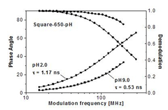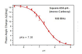Square-650-pH is a NIR probe that exhibits a pKa around 7 and is therefore useful for measurement of pH changes in the physiologically relevant pH range from pH 6 to pH 8. Importantly, both forms (protonated as well as unprotonated) of Square-650-pH are fluorescent, and they exhibit different lifetimes, which makes this compound useful for lifetime-based applications (see Figure below). For more information about these dyes, we refer you to their spec sheets and the published literature.