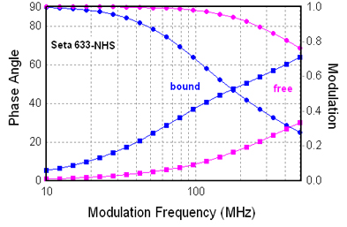 These proprietary long-lifetime labels with lifetimes up to 32 ns in water are excitable in the UV or blue region. They are useful as polarization probes for the measurement of high MW analytes (small - medium size proteins). The measurement of BSA (MM of 65 K) in a FP assay with SeTau-425-NHS demonstrates that a suitable dynamic range can be achieved even for large antigens with this long-lifetime polarization probe. Importantly, the FLT of these labels does not change upon labeling or binding to proteins or other analytes. Several labels with fluorescent lifetimes of 32, 26, and 9 ns in aqueous environments are available.