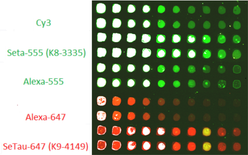 Above is a comparison of our Seta-555 and SeTau-647 dyes with other dyes commonly used in these microarrays. The dyes were diluted 4x starting from 100 ug/ml, 10 spots. The data shows a much higher fluorescence signal coming from the Seta-555 and SeTau-647 dyes, and there was also no detectable channel-to-channel crosstalk (data not shown). These dyes are ideal for both one- and two-color microarray measurements and have much higher ozone stability compared to the dyes of our competitors. Try and experience the difference yourself!