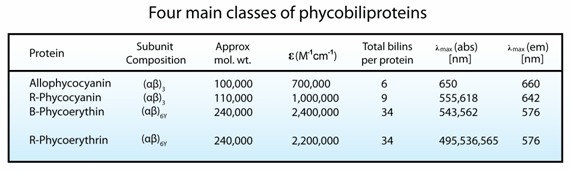 The main classes of phycobiliproteins are: Allophycocyanin, R-Phycocyanin, B-Phycoerythrin, R-Phycoerythrin: