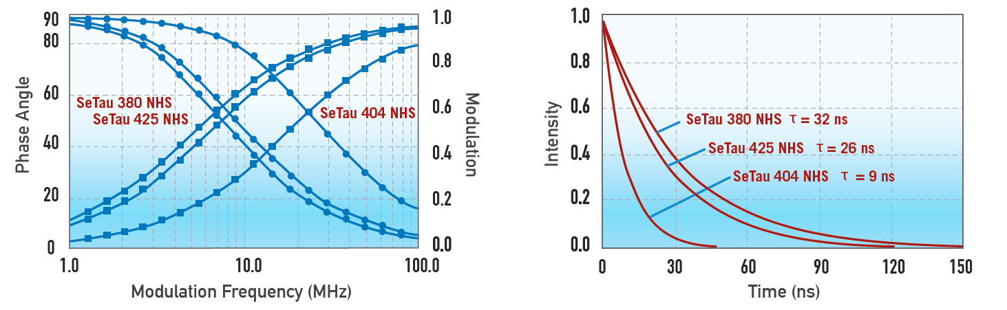 The SeTau lifetime labels have lifetimes in the range between 32 and 9 ns. These dyes are excitable in the UV or blue region and are also useful as polarization probes for the measurement of high MW analytes (small proteins).