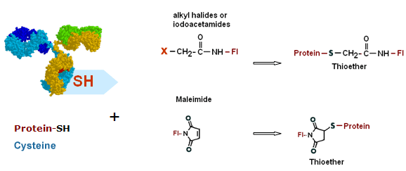 Maleimides are the preferred functionality for labeling of small molecules such as peptides and oligo-nucleotides. Maleimides form bonds with thiols at relatively mild conditions and with reasonable yields. Maleimides are less susceptible to hydrolysis in comparison with NHS esters.