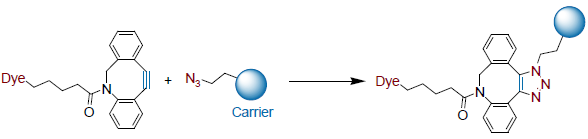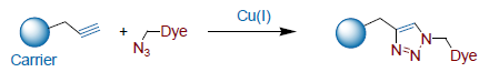 Several of our most sensitive Seta Dyes are now available as azides to be reacted with C≡C-triple bonds in either a Cu(I)-catalized or Cu-free 1,3-dipolar cycloaddition reaction to a triazole (see figure). Both reactions proceed in aqueous environments with adequate efficiency.