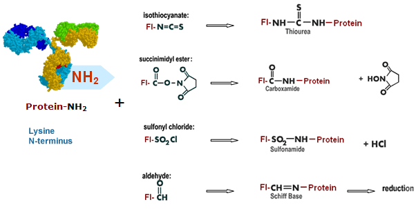 Among all these functionalities N-hydroxysuccinimide (NHS) ester are the preferred reactive functionality for labeling of amino-groups due to the formation of highly stable amide bonds with amines. Sulfonyl chlorides also form stable sulfamide bonds but the reaction also generates HCl, which is a not so desirable by-product. In addition sulfonyl chlorides are more difficult to synthesize.