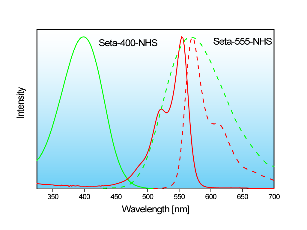 Seta-375-NHS (K4-205) is an extremely bright, reactive label for use with the UV and blue light sources (340 − 380 nm) and has a large Stokes' shift of 108 nm. It is a good alternative to Atto 390 or Alexa 350. Exc./Em. max: 372/480 nm.