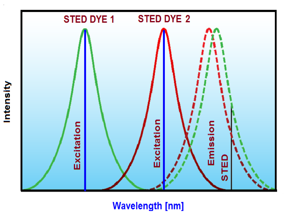 Until recently, STED utilized mostly bright and photostable dyes with small Stokes shifts between 20–50 nm. Nevertheless, the need for multiplexing makes organic fluorophores having large Stokes shifts also a valuable asset in this technique. Two-color STED microscopy can be achieved by combining two fluorescent dyes, one with a small (10 − 30 nm) and the other having a large (>80 nm) Stokes shift. Provided the emission spectra of these dyes overlap, two different excitation wavelengths can be used to distinguish them, and due to the overlapping emission spectra, the same STED wavelength can be utilized for the depletion of both dyes.